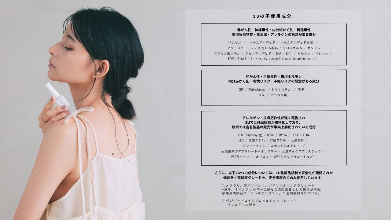 一般的なネイル製品(ジェルネイルに限らず、マニキュアやリムーバーなど)の中には、ホルモンや爪や肌への刺激となるおそれがある成分が多く含まれていることがあります。